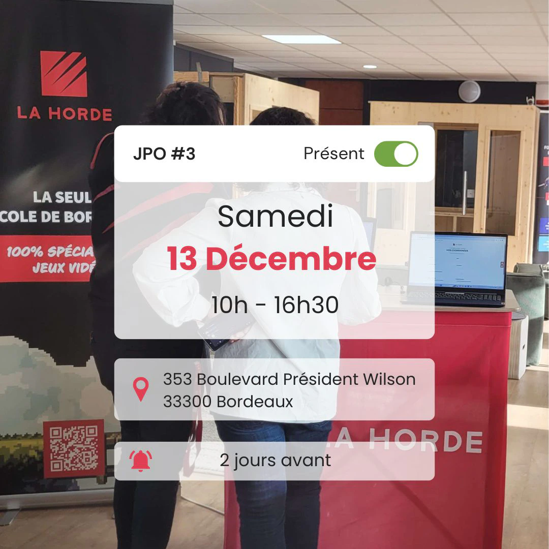 Participez à notre Journée Portes Ouvertes du 14 février 2026 à La Horde, l’école supérieure des métiers du jeu vidéo! C’est l’occasion idéale pour découvrir nos formations et vous préparer aux étapes clés de Parcoursup. Venez rencontrer notre équipe pédagogique, échanger avec nos étudiants, et explorer comment nos programmes peuvent soutenir votre projet professionnel. Ne manquez pas cette chance de mieux connaître notre école et de poser toutes vos questions sur votre ...